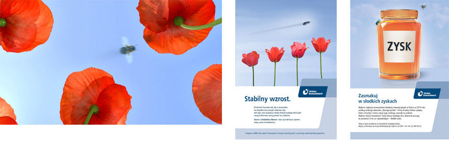 We could not touch the grid nor the name, but could propose something innovative, very different from the competition. Thus taking a risk, that the target group would dislike the campaign. The management of Union Investment decided to go ahead without any focus groups - bravo! The initial part of the campaign showed ... bees, as a metaphor for their busy, successful stockbrokers, with 'honey' as 'profit'.